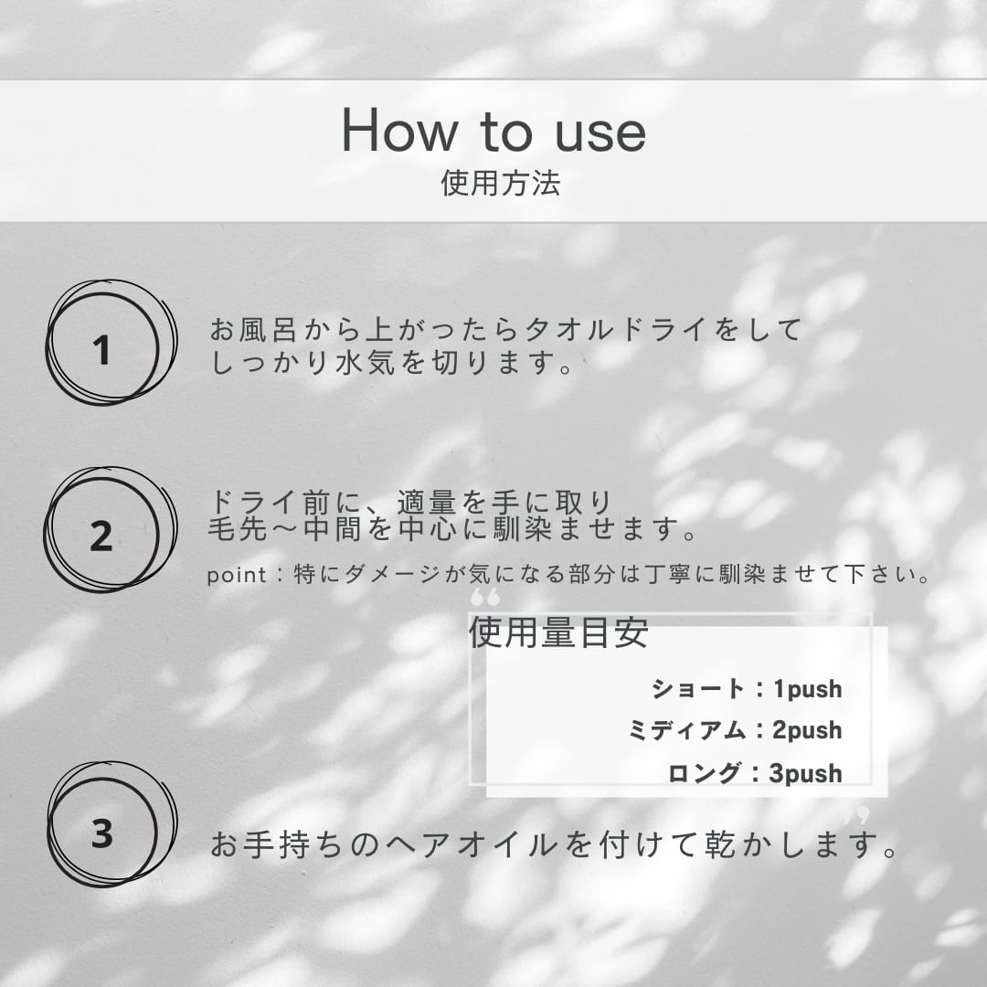 1. 濡れた髪に適量を手に取り、髪全体になじませてください。